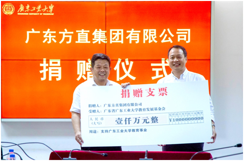 2019年10月9日,“方直獎學金”捐贈儀式在廣東工業(yè)大學大學城校區(qū)行政樓舉行。方直集團董事長陳專先生向學校捐贈1000萬元,廣工校黨委書記、校長陳新教授為方直集團頒發(fā)捐贈證書,并在方直設立“廣東工業(yè)