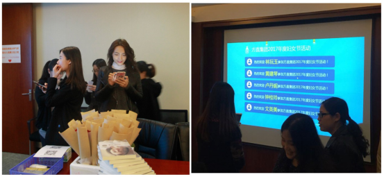 下午四點(diǎn)三十分,女同胞們陸續(xù)用手機(jī)掃碼簽到。看到大屏幕上同步顯示“熱烈歡迎XXX參加方直集團(tuán)2017年度婦女節(jié)活動(dòng)”時(shí),有女同胞表示受寵若驚,同時(shí)感概“互聯(lián)網(wǎng)+”簽到真是方便快捷。