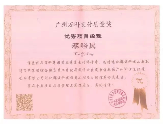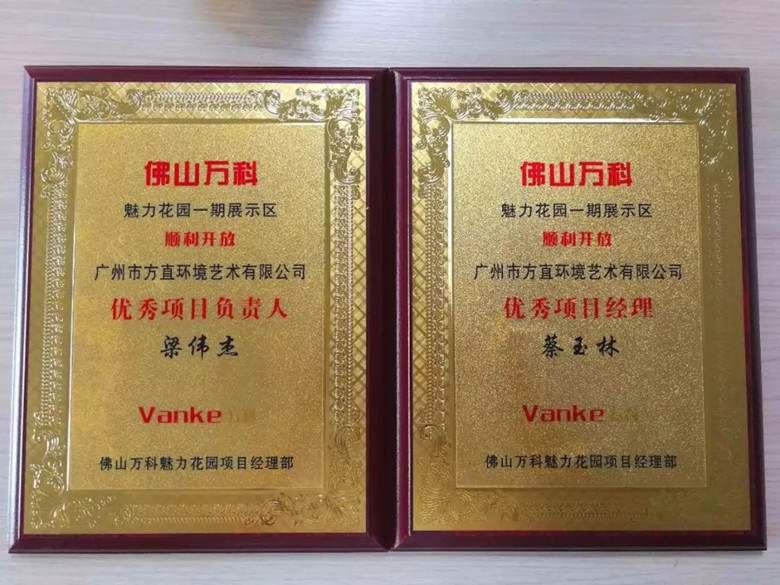 方直環(huán)境-佛山萬科魅力花園項(xiàng)目經(jīng)理部-梁偉杰、蔡玉林分別榮獲優(yōu)秀項(xiàng)目負(fù)責(zé)人和優(yōu)秀項(xiàng)目經(jīng)理表彰獎(jiǎng)項(xiàng)!