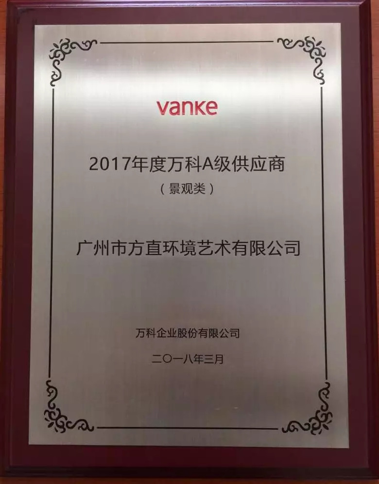 2018年3月榮獲2017年度萬科A級(jí)供應(yīng)商(景觀類)