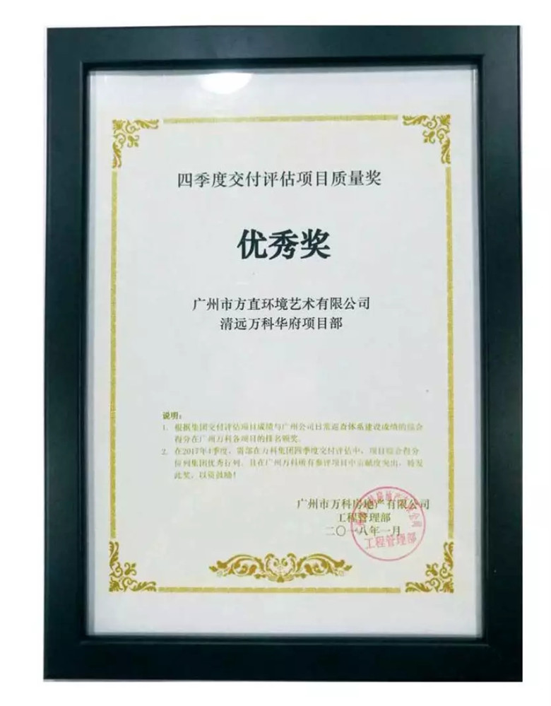 2018年1月榮獲2017年四季度交付評(píng)估項(xiàng)目質(zhì)量?jī)?yōu)秀獎(jiǎng)(清遠(yuǎn)萬科華府)