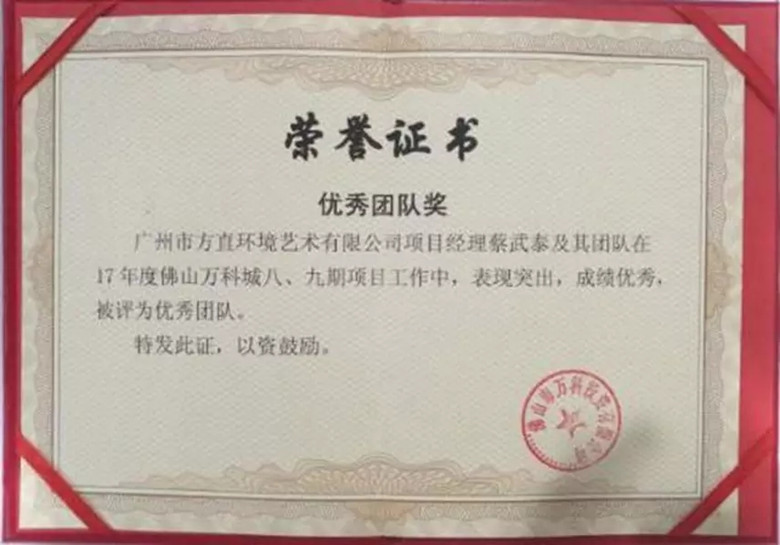 2018年1月榮獲2017年度優(yōu)秀團(tuán)隊(duì)(佛山萬科城八、九期)