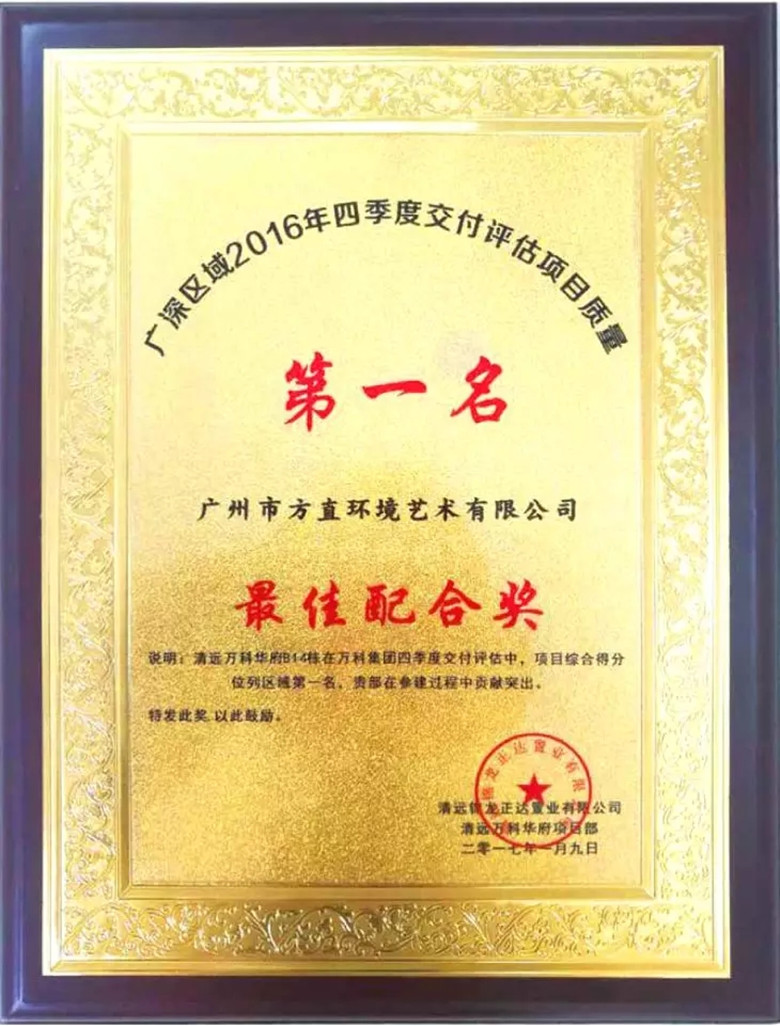 2017年1月榮獲2016年四季度交付評(píng)估項(xiàng)目質(zhì)量第一名(最佳配合獎(jiǎng))