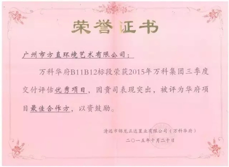 2015年10月榮獲2015年三季度最佳合作方(清遠(yuǎn)萬科華府)