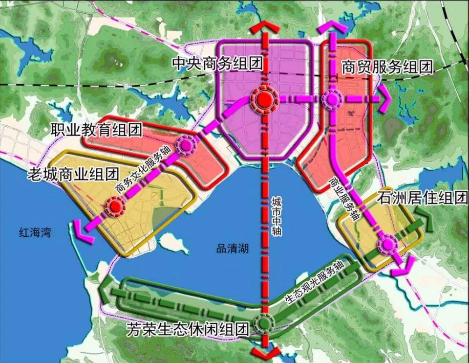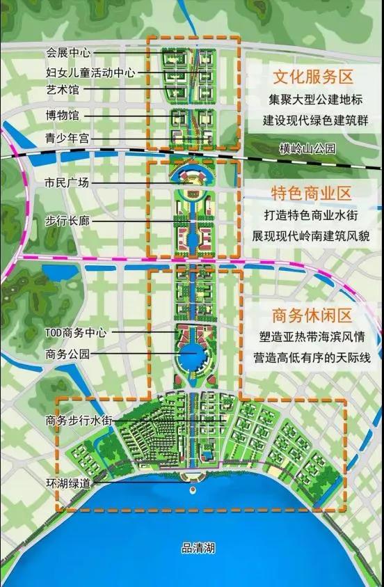 汕尾城市中軸線以汕尾高鐵站為起點(diǎn),沿著中軸西路(建設(shè)中)、站前橫路、汕尾大道等城市主干道向四周延伸,一直延伸至品清湖。