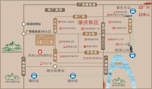 2、高鐵:廣州南站→佛山西站→肇慶東站→坐車至方直亞汀公館